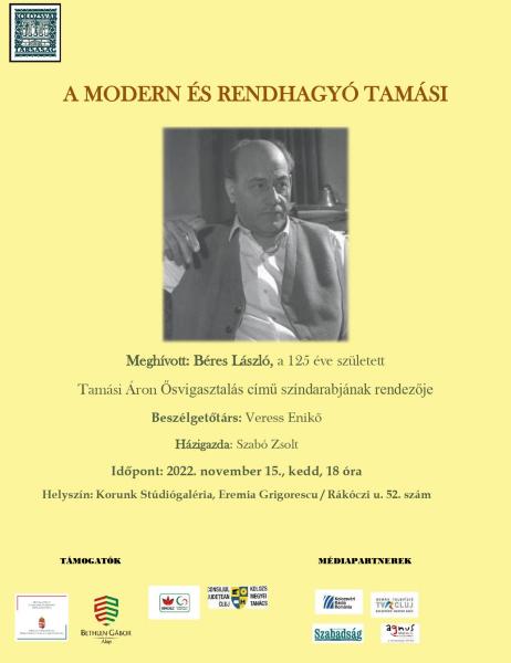 2022. november 15-én, kedden 18 órakor a Korunk Stúdiógalériában (Eremia Grigorescu/Rákóczi u. 52. szám) a modern és rendhagyó Tamási Áronról tartunk beszélgetőestet Béres Lászlóval, Tamási Áron: Ősvigasztalás című színdarabjának rendezőjével. Az 1924-ben született művet a Kolozsvári Állami Magyar Színház az idén októberben mutatta be, ezzel emlékezve a 125 éve született íróra.