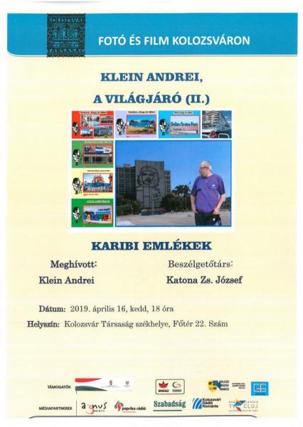 Fotó és Film Kolozsváron sorozat keretén belül "Klein Andrei, a, világjáró (II:): Karibi emlékek" címmel vetíttképes előadásra került sor. Meghívott Klein Andrei fotóművész, aki az utazásairól készült fényképkollázst mutatta be az érdeklődőknek. Beszélgőtárs: Katona Zs. József