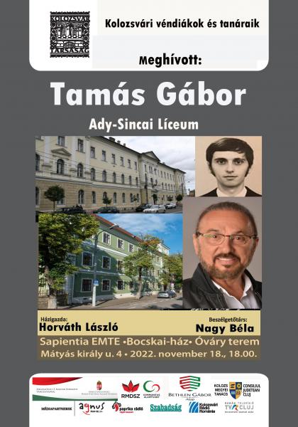 A Kolozsvári véndiákok és tanáraik sorozat meghívottja az ismert könnyűzene énekes és zeneszerző, Tamás Gábor, az egykori Ady–Şincai Középiskola/a mostani Református Kollégium véndiákja lesz. A sorozatindító beszélgetőestre a Sapientia EMTE Mátyás király u. 4. szám alatti székházának Óváry-termében kerül sor. A meghívott beszélgetőtársa Nagy Béla, az est házigazdája Horváth László.